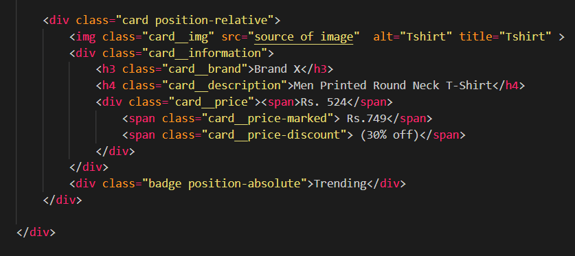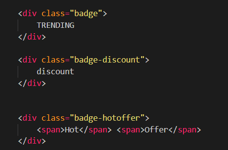 This component can be used to apply various badges like Discount , Trending, Hot Offers etc..You can use them in your cards.And in addition you need to apply "position:relative" to the badge's parent and "position:absolute" to the badge.